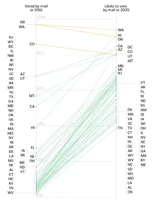 As of July 2020, five states—Colorado, Hawaii, Oregon, Utah and Washington—hold elections almost entirely by mail, with Hawaii and Utah adopting full vote-by-mail elections in 2020.[10] Postal voting is an option in 33 states and the District of Columbia. Other states allow postal voting only in certain circumstances, though the COVID-19 pandemic in 2020 has prompted further discussion about relaxing some of those restrictions. In the run up to the 2020 United States presidential election, then-President Donald Trump repeatedly asserted that mail-in voting would result in widespread fraud, and indicated that he would block necessary funding for the postal service. Among other things, this funding would have been used to ensure that mail-in votes were processed securely[11] and on time.[12] In September 2020, the Homeland Security Department issued an intelligence bulletin asserting "Russia is likely to continue amplifying criticisms of vote-by-mail and shifting voting processes amidst the COVID-19 pandemic to undermine public trust in the electoral process."[13]
