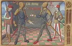 He fought at the battle of Verneuil in 1424. His participation, along with Joan of Arc, in the battle at Orléans in 1429 led to the end of the Siege of Orléans.[1] He was badly wounded during this battle. He was captured by the Earl of Warwick in a skirmish at Savignies near Beauvais in 1431. In 1433 he was exchanged for John Talbot.[2] Jean Poton fought numerous battles alongside Joan of Arc during the Loire Campaign and retained a lifelong support for her. With La Hire, he even tried, albeit in vain, to rescue Joan after she was captured. Believing Joan was being held captive in Compiègne, Jean Poton captured it, only to learn that the prisoner had already been moved to Rouen.[1]