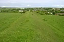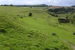 Further buildings and enclosures of the 5th-8th centuries overlie the Roman cemetery.[1] It is roughly rectangular and it is likely that it was designed to command views over the River Frome and the Frome valley to the north. The main entrance to the fort is on the eastern end. It overlooks the county town of Dorchester, Dorset, England.