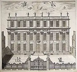 The first version of Powis House was built in the 1690s for William Herbert, 2nd Marquess of Powis, member of the Herbert family. No drawings of this version survive. At some point it was let for use as the French embassy, and on 26 January 1713 it burned to the ground, while the Ambassador, the Duc d'Aumont, was entertaining.[1] Jonathan Swift attributed this event to "the carelessness of the rascally French servants". A replacement house was soon built. It had three main storeys above an arched basement and was 104 feet (32 metres) wide. The subtle but lively façade featured Corinthian pilasters and a phoenix above the front door. The architect is unknown, but may have been French. The staircase walls were painted by the Venetian painter of the rococo, Giacomo Amiconi.