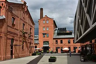 Warsaw Vodka Factory "Koneser", originally Spirit Distillation Plant (Polish: Fabryka Oczyszczania Spirytusu), was established in 1897 on the initiative of the Polish-Russian Warsaw Society of Distillation and Sale of Spirits. In those days, on the premises of the factory, apart from industrial buildings, the factory complex included warehouses, workshops, residential buildings and a school. At the time the factory was one of the most technologically advanced production plants in Warsaw. The interwar period was the prime of the factory, which at that time was also referred to as the Monopoly. The factory employed more than 400 people, and its production capacity totalled at quarter of a million bottles of vodka a day. In the 1920s "Koneser" created universally recognizable vodka brands such as: Wyborowa, Luksusowa, Żubrówka, Żytniówka and Siwucha. The further development of the plant was disrupted by the outbreak of World War II. As a result, the production was significantly reduced and subsequently stopped.[6] In the late 1940s, after World War II and necessary revitalization of the factory, the production was resumed and it continued up to the last decade, when the worsening condition of the company led to the end of production and shutdown of the factory.[7] Along with the acquisition of the land by BBI Development the idea of the Praga Koneser Center was born.[8]