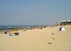 Praia de Valadares is located on the western coast of northern Portugal. It has an Atlantic-Mediterranean climate. It presents a green dune system that expands in the south.[1] The native vegetation is mainly composed by pine trees. The forest areas in Praia de Valadares have a mix of pine trees and eucalyptus. The beach is divided by north and south (Praia de Valadares Norte and Praia de Valadares Sul), both considered Blue Flag beaches.[2][3] The beach has several bars and cafés.