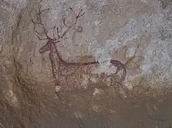 Most of the representations are of animals (bison, horse, deer, bull, reindeer, goat, bear, mammoth, moose) and are painted in ochre and black colors but there are exceptions and human-like forms as well as abstract drawings also appear in some sites. In the Mediterranean and interior areas, the presence of mural art is not so abundant but exists as well since the Solutrean. The monumental Côa Valley has petroglyphs dating up to 22,000 years ago. These document continuous human occupation from the end of the Paleolithic Age. Other examples include Chimachias, Los Casares or La Pasiega, or, in general, the caves principally in Cantabria (in Spain).