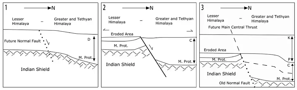 This model illustrates that in Carboniferous, due to possible rifting,[4] the Lesser and Greater Himalaya were separated by a north-dipping normal fault. In this reconstruction, the former is the footwall and the latter is the hanging wall.