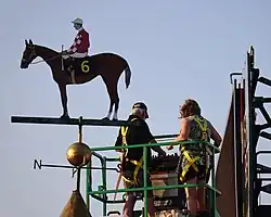 As soon as the Preakness winner has been declared official, a painter climbs a ladder to the top of a replica of the Old Clubhouse cupola. The colors of the victorious owner's silks are applied on the jockey and horse that are part of the weather vane atop the infield structure. The practice began in 1909 when a horse and rider weather vane sat atop the old Members' Clubhouse, which was constructed when Pimlico opened in 1870. The Victorian building was destroyed by fire in June 1966. A replica of the old building's cupola was built to stand in the Preakness winner's circle in the infield.[27]
