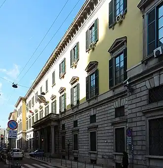 However, financial difficulties forced Diotti to sell the building in 1803 to the short-lived Napoleonic Italian Republic, passing to Napoleon’s Kingdom of Italy when it was created in 1805.[3][1] The building was used as the Ministry of the Interior for the new kingdom. After the Napoleonic period, the building became a centre of government of the Austrian-ruled Kingdom of Lombardy–Venetia from 1815 to 1859. In 1817, further work on the facade was carried out under the direction of Gilardoni. In 1849, it became the seat of the Austrian Lieutenant (or Governor) of Lombardy. Following Italian unification, it was chosen, in 1859, as the seat of the Prefecture of Milan in the new Kingdom of Italy,[1] the Prefect being the representative of the national government at provincial level.[4] Since then, it has remained as the seat of the Prefect of the former Province of Milan, and from 2015, its successor, the Metropolitan City of Milan.