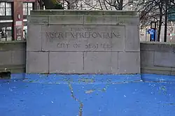The fountain is the city's oldest, completed in 1925, on land deeded to the city in 1912.[2] The park and fountain were dedicated in June 1926 to the late Francis X. Prefontaine, a Catholic priest who built the city's first Catholic church and provided $5,000 for the fountain's construction.[3] The park and fountain were rebuilt during construction of the Downtown Seattle Transit Tunnel and adjacent Pioneer Square station in the late 1980s, reopening in 1990.[4] The fountain and sidewalk between it and Pioneer Square station have been fenced off since 2023.[5]