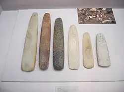 In Seokjang-ri and in other riverine sites, stone tools were found with definite traces of Palaeolithic tradition, made of fine-grain rocks such as quartzite, porphyry, obsidian, chert, and felsite manifest Acheulian, Mousteroid, and Levalloisian characteristics. Those of the chopper tradition are simpler in shape and chipped from quartz and pegmatite. Seokjang-ri's middle layers showed that humans hunted with these bola or missile stones.