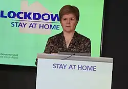 Sturgeon announced to the Scottish Parliament on 18 March that all schools and nurseries in Scotland would close on 20 March to try and limit the spread of the virus.[84] On 23 March, Sturgeon issued a statement, placing Scotland on a "lockdown", limiting the reasons as to why people may leave their homes in an increase attempt to limit the spread of the virus, to protect the health of the population, as well as to ease the pressure the virus places on NHS Scotland services and workforce.[85] Since then restrictions have been frequently tightened, loosened and adapted in parts or all of Scotland to respond to developments in the situation.[86]
