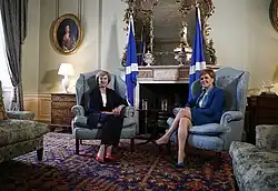 On 18 November 2014, Salmond formally resigned as First Minister of Scotland and the election for the new first minister took place the following day.[18] Sturgeon and Ruth Davidson, the leader of the Scottish Conservatives, stood for election. Sturgeon received 66 votes, Davidson received 15 and there were 39 abstentions. As mentioned above, the SNP's absolute majority made Sturgeon's election all but certain.[19] Although, Salmond did not officially tender his resignation as First Minister until 18 November 2014, Sturgeon was not sworn in until two days later. From 18 November until her officially appointment on 20 November, she served as the acting First Minister, essentially the First Minister-elect.[20]