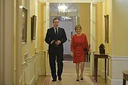 On 4 April 2015, a leaked memo from the Scotland Office alleged that Sturgeon privately told the French ambassador Sylvie Bermann that she would "rather see David Cameron remain as PM". This was in contrast to her publicly stated opposition to a Conservative Government on the run up to the election.[27] The memo was quickly denied by both Sturgeon and the French consulate.[28][29] It was later noted that the memo had contained a disclaimer that parts of the conversation may have been "lost in translation" and its release had been ordered by then Scottish Secretary Alistair Carmichael.[30][31] Sturgeon stated that Carmichael had "engaged in dirty tricks" and that he should consider his position as an MP.[32]