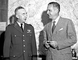 Prescott Bush sought a rematch with Sen. Benton in 1952, but withdrew as the party turned to William Purtell. The death of Senator Brien McMahon later that year, however, created a vacancy and this time the Republicans nominated Bush.[15] He defeated the Democratic nominee, Abraham Ribicoff, and was elected to the Senate. A staunch supporter of President Dwight D. Eisenhower, he served until January 1963. He was re-elected in 1956 with 55% of the vote over Democrat Thomas J. Dodd (later U.S. Senator from Connecticut and father of Christopher J. Dodd), and decided not to run for another term in 1962. He was a key ally for the passage of Eisenhower's Interstate Highway System,[16] and during his tenure supported the Polaris submarine project (built by Electric Boat Corporation in Groton, Connecticut), the establishment of the Peace Corps,[17] and voted in favor of the Civil Rights Acts of 1957 and 1960 and the 24th Amendment to the U.S. Constitution.[18][19][20][21]