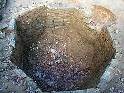 An archaeological excavation of the Liberty Bell Center's footprint was undertaken in November and December 2000.[1] The most significant President's House-related artifact uncovered was the bottom half of its icehouse pit.[17] A technological marvel built by Robert Morris in the early 1780s, the icehouse had been a windowless building erected over an octagonal stone-walled pit, 13 ft (4.0 m) in diameter and 18 ft (5.5 m) deep.[18]: 46–53 In midwinter the pit would be packed with blocks of ice harvested from the Schuylkill River.[19] The icehouse provided refrigeration for most of the year:
