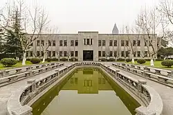 Two cedars were planted in 1934 by Chairman Lin Sen on both sides of the courtyard in the front of the Presidential Building. The cedar on the east side was dead in 2005 and was cut down in 2013.[1] The building was designed by Yu Binglie, who was the head of the department of architecture, National Central University. Inside the house, the first floor was served as the office of the Secretary-General to the President, the highest-ranking official in the Office of the President who supervised the staff of the Office. The presidential office and vice presidential office were both on the second floor. The meeting room of the State Affair Council was located on the third floor.
