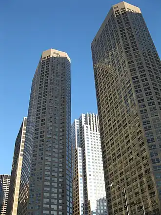 The complex is composed of four 49-story residential skyscrapers sitting atop a four-story, 1162-space parking garage and 135,193 square foot (12,559.8 m2) retail base. The towers are all staggered in their placement upon the site to maximize skyline views of the nearby Chicago Loop and surrounding neighborhoods for each of the 2346 apartment units. The complex was built in an area once known as Chicago's skid row and was designed to be a self-contained community with an inward-facing mall located within the towers' base.[3]
