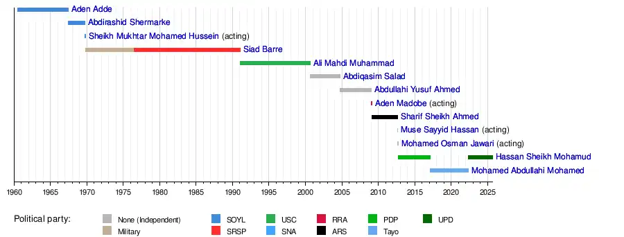 | 1 | Aden Adde (1908–2007) | 1 July 1960 | 10 June 1967 | 6 years, 344 days | SYL | 1960 | |