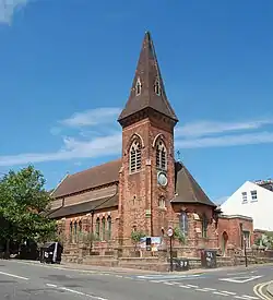 St Luke's Church (50°50′01″N 0°08′51″W / 50.833559°N 0.147597°W) occupies a "landmark"[31] position at the junction of Old Shoreham Road and Stanford Road in the south of Prestonville, near Seven Dials. This Anglican church was built in 1875 to the design of John Hill. Its Gothic Revival church hall on Exeter Street dates from 1884 and retains its original red-brick exterior.[13] The Church of the Good Shepherd (50°50′30″N 0°09′28″W / 50.841733°N 0.157902°W) is at the junction of Dyke Road and The Drove in the north of Prestonville. It was built between 1920 and 1922 and was designed by Edward Prioleau Warren. Both the church and the small brick walls surrounding it are Grade II-listed.[32][33] It is a brown-brick building in a late and "simple" interpretation of the Gothic Revival style. The tower and an extra bay to the nave were added in 1925–27,[34] and the church hall was opened by George Tryon, 1st Baron Tryon on 15 July 1936. The church was funded as a memorial to former Vicar of Preston Rev. Gerald Moor.[3] The Al-Quds Mosque (50°50′05″N 0°09′03″W / 50.834691°N 0.150736°W) was founded in the 1970s when a group of Muslims who were visiting the area donated money to fund an Islamic centre and mosque. The community bought a converted house which had been used as a nursery school.[35]