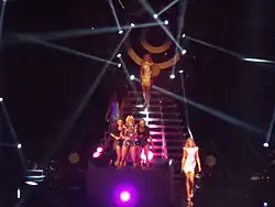 On November 22, 2010, Hilson performed "Pretty Girl Rock" on The Tonight Show with Jay Leno.[59] She later performed the song at the 84th Annual Macy's Thanksgiving Day Parade on November 25.[60] Hilson was dressed in pink and performed the song on My Princess Academy's "Castle of Dreams" float high above a pink castle.[60] On December 3, Hilson performed "Pretty Girl Rock" at the VH1 Divas Salute the Troops concert.[61] She took to the stage dressed in a gold bustier with high-waisted pants and a fringe-laden jacket to perform the song in front of an audience that included members of the US Armed Forces.[61] Hilson was backed by four female dancers, who wore stylized military jackets.[61] Mawuse Ziegbe from MTV News wrote that, "Hilson brought her saucy, sexpot swagger to the stage."[61] The promotion of the song continued on December 7, when she performed a remixed version of "Pretty Girl Rock" on Lopez Tonight, dressed in a silver and black leotard.[62] Hilson later performed "Pretty Girl Rock" on December 14 on the Today Show, mixing the track with James Blunt's single "You're Beautiful".[63] For the performance, she wore a glittery multi-colored jacket over a black blouse, skin-tight jeans and stilettos.[63]