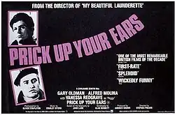 Prick Up Your Ears is a 1987 British film, directed by Stephen Frears, about the playwright Joe Orton and his lover Kenneth Halliwell. The screenplay was written by Alan Bennett, based on the 1978 biography by John Lahr. The film stars Gary Oldman as Orton, Alfred Molina as Halliwell, Wallace Shawn as Lahr, and Vanessa Redgrave as Peggy Ramsay.
