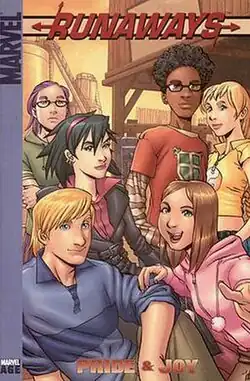 ![]() Cover of Runaways: Pride & Joy (2004), trade paperback collected edition Featuring (back) Gertrude, Nico, Alex, Karolina, (front) Chase, and Molly, art by Takeshi Miyazawa | |