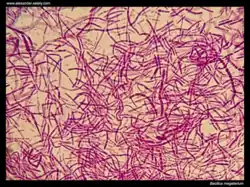 Priestia megaterium[1] (Bacillus megaterium prior to 2020)[2] is a rod-like, Gram-positive, mainly aerobic, spore forming bacterium found in widely diverse habitats.[3][4] It has a cell length up to 100 μm and a diameter of 0.1 μm, which is quite large for bacteria.[5] The cells often occur in pairs and chains,[3] where the cells are joined by polysaccharides on the cell walls.