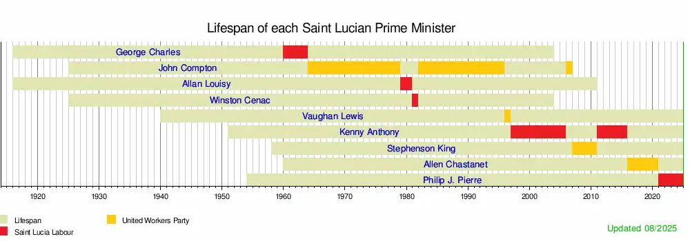 This is a graphical lifespan timeline of prime ministers of Saint Lucia. They are listed in order of office (Compton and Anthony are shown in order of their first premierships).