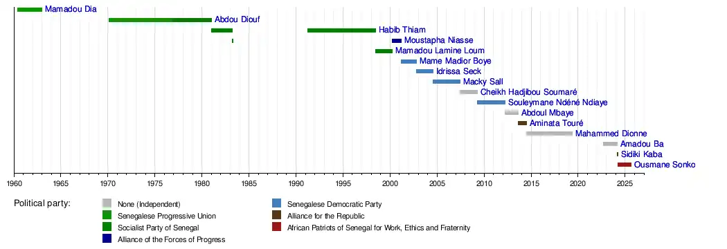 3 April 2024 | Incumbent | 1 year, 139 days | PASTEF | Bassirou Diomaye Faye |