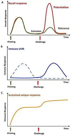 Results of immune priming research commonly find that mechanism conferring defense against a given pathogen is dependent on the kind of insect species and microbe used for given experiment. That could be due to host-pathogen coevolution. For every species is convenient to develop a specialised defense against a pathogen (e.g. bacterial strain) that it encounters the most.[6] In arthropod model, the red flour beetle Tribolium castaneum, it has been shown that the route of infection (cuticular, septic or oral) is important for the defence mechanism generation.[7] Innate immunity in insects is based on non-cellular mechanisms, including production of antimicrobial peptides (AMPs), reactive oxygen species (ROS) or activation of the prophenol oxidase cascade. Cellular parts of insect innate immunity are hemocytes, which can eliminate pathogens by nodulation, encapsulation or phagocytosis.[8] The innate response during immune priming differs based on the experimental setup, but generally it involves enhancement of humoral innate immune mechanisms and increased levels of hemocytes. There are two hypothetical scenarios of immune induction, on which immune priming mechanism could be based.[7][9] The first mechanism is induction of long-lasting defences, such as circulating immune molecules, by the priming antigens in the host body, which remain until the secondary encounter. The second mechanism describes a drop after the initial priming response, but a stronger defence upon a secondary challenge. The most probable scenario is the combination of these two mechanisms.[7]