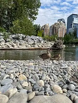 The island has a surface of 20 hectares[1] and is linked by three bridges to Eau Claire and downtown Calgary and a north bridge to Memorial Drive and the community of Crescent Heights. It is part of the pathway and hiking trail system lining both sides of the Bow River. The southern arm of the river has been landscaped, while the eastern end of the island re-creates a wetland environment. Canada geese and mallard ducks are common birds found in the park.