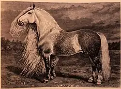 Chaldean was a Percheron stallion best known for his very long, abundant mane.[2][3][1] It reached a length of over 2.20 m (7 feet 4 inches) in 1890, according to its second owner Babcock.[1][3] This feature was described in the Breeder's Gazette as "out of the ordinary".[3] His mane was measured at 9 feet and two inches (2 meters and 80 centimeters) two years later, in 1892, his tail being the same length.[9][10][8] His weight exceeded 1,800 pounds (810 kg) in 1892.[4]