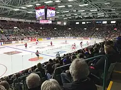 The Cougars missed the playoffs in their first two seasons, but made two runs to the Division finals over the following four seasons, first finding success under coach Stan Butler. However, the Cougars missed the playoffs altogether seven times between 2003 and 2014, and sagging attendance led to the team being put up for sale, threatening relocation.[4] In late 2013, owner Rick Brodsky initiated the sale process; local investor Greg Pocock sought the team, and partnered with former Cougars Dan Hamhuis and Eric Brewer to form an investors group committed to keeping the team in Prince George.[5] The sale was approved by the WHL on April 30, 2014.[6] The new ownership immediately sought to revitalize the team, renovating team facilities and seeking community partnerships.[2][4] On the ice, the team won its first B.C. Division regular season title in 2016–17.[2]