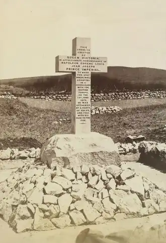 The death of the Prince Imperial caused international outrage as Queen Victoria only authorised him to go providing the army kept him out of danger. Queen Victoria ordered the erection of a memorial on the spot where he died, paying for it personally.[5][6] The cross was enscribed "'This cross is erected by Queen Victoria, in affectionate remembrance of Napoleon Eugene Louis Jean Joseph Prince Imperial, to mark the spot where, while assisting in a reconnaissance with the British troops, on the 1st June 1879, he was attacked by a party of Zulus, and fell with his face to the foe."[2] When the memorial was finished, Zulu warriors saluted it with British Army soldiers.[7]