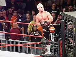 When Adam "Pacman" Jones joined TNA, Young was desperate to get an autograph, but ended up getting attacked by Ron Killings and spray painted by Pacman. Young started teaming up with Shark Boy on a consistent basis, nearly winning the number one contenders spot to the Tag Team Championship. Young was Judas Mesias' opponent in his official debut match, and was badly injured despite Shark Boy's rescue attempt. On the October 4 edition of Impact, Young faced and defeated James Storm in a Gauntlet match when he reversed Storm's sleeper hold into a pin.[26] At Bound for Glory, Young won the 15 men Fight for the Right Battle Royal by pinning Robert Roode with a small package to win the first round.[27] He was eliminated from the tournament in the second round after being pinned by Storm.[28] From there, Young and Storm engaged in a storyline which saw them compete in beer drinking contests, most notably at Genesis, where Young took Storm's World Beer Drinking Championship belt after Storm passed out.[29] Young defended the belt on the last Impact! before Turning Point in a 60-second speed drinking contest and won, but was assaulted by Storm.[30] He went on to defeat both Storm and the Angle Alliance, the latter as Samoa Joe and Kevin Nash's replacement partner for Scott Hall in matches at Turning Point.[31][32]