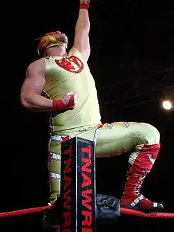 Team Canada began feuding with The Naturals and Lance Hoyt, with Young, Roode and A-1 defeating Hoyt and The Naturals at No Surrender on July 17.[12] America's Most Wanted formed a loose alliance with The Naturals against Team Canada, with Young, Roode, Williams and A-1 defeating The Naturals and America's Most Wanted at Sacrifice on August 14.[13] After Williams renewed his pursuit of the X Division Championship, Young began teaming with A-1 on a regular basis. At Unbreakable on September 11, Young and A-1 faced America's Most Wanted, Alex Shelley and Johnny Candido and defending champions The Naturals in a four-way tag match. Young was able to pin both Candido and "Wildcat" Chris Harris, but Team Canada lost the match after Chase Stevens managed to pin A-1.[14]