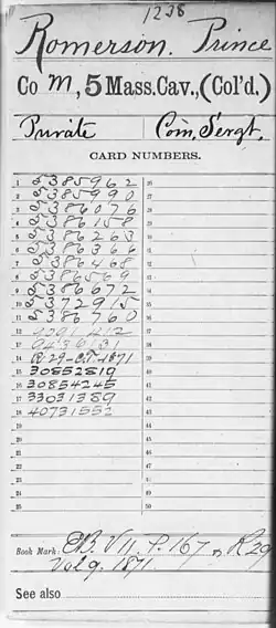 - "Enlistment Records for Prince Romerson". Civil War Compiled Service Records. Washington, DC: The National Archives and Records Administration. 2010. Retrieved June 5, 2016.