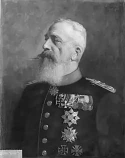 In 1895, Kaiser Wilhelm II promoted him à la suite to the Grenadier Regiment (German: Leibgrenadierregimentes) in honor of the 25th anniversary of the Battle of Nuits-Saint-Georges.[1] At the same time, Wilhelm II made him knight of the Order of Pour le Mérite, the Kingdom of Prussia's highest military order.[1]