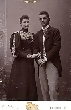 Princess Louise was raised with her siblings in the royal household in Denmark and grew up between her parents' city residence in Copenhagen, the Frederik VIII's Palace at the Amalienborg Palace complex, and their country retreat, the Charlottenlund Palace, located by the coastline of the Øresund strait north of the city. In contrast to the usual practise of the period, where royal children were brought up by governesses, the children were raised by Crown Princess Louise herself. Under the supervision of their mother, the children of the Crown Princess received a rather strict Christian-dominated upbringing, which was characterized by austerity, the fulfilment of duties, care and order. Like her siblings, she was educated privately under the supervision of tutors. From childhood, Louise was described as a very withdrawn girl with a shy and quiet personality.[3] As she also married and left Denmark at an early age, she remained a relatively unnoticed member of the Danish royal family throughout her life.[4]