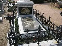 On 10 May 1873 Johannes van Rossum, Marianne's partner for 25 years and the love of her life, died from comsumpition aged 63 at Schloss Reinhartshausen. Although Marianne had reserved space for two more graves next to her son in the deed of foundation of the Johanneskirche, for herself and van Rossum, at the end van Rossum was buried on 14 April in the public cemetery of Erbach, as was noted in the church book of the Johanneskirche;[7] there had been arguments with the pastor,[8] as recorded in the pastor's wife's memoir. It may be assumed that he was annoyed by the unconventional life of the couple and therefore denied the burial of van Rossum in the church crypt.[9] Marianne then ordered in 1876 to be buried there as well, in a simple oak coffin side by side with her partner. She appointed her son Prince Albert of Prussia as executor of her last will.[10]