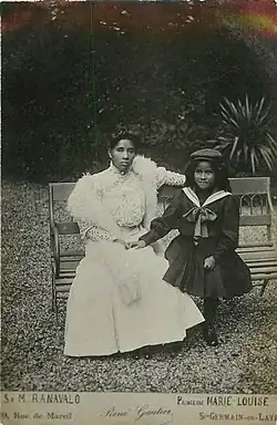 Princess Marie-Louise of Madagascar was born in exile on 1 May 1897 at the Hotel de l'Europe in Saint-Denis, Réunion. Her mother, Princess Razafinandriamanitra, was a daughter of Princess Rasendranoro and a niece of Ranavalona III. She was an illegitimate child, as her mother had conceived her with an unknown French soldier. She was born while the royal family was in exile in French territory after the Malagasy monarchy was abolished due to French colonial rule. Her mother died five days after giving birth. Although the royal family were Protestant, Marie-Louise was baptized in the Catholic faith at the Cathedral of St. Denis to appease the French.[1] She was later adopted by Queen Ranavalona and was, according to the traditional rules of succession, the heir apparent to the abolished throne of Madagascar.[2]