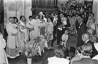 During her childhood and adolescence, she was educated in the United States and in Quebec.[10] Throughout her youth, she was active in society and attending various balls, including the Paris Ball held at the French Embassy in Brussels.[11] In 1964, she attending the wedding of Princess Irene of the Netherlands and her brother, Prince Carlos Hugo, in Rome.[12] Also, in July 1964, she represented her family at the wedding of Prince Guy of Bourbon-Parma, her cousin, with Brigitte Peu-Duvallon, in Cannes, France.