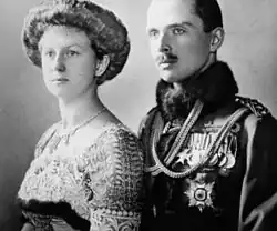 On 11 October 1905, at Glücksburg Castle, Schleswig, she married Charles Edward, Duke of Saxe-Coburg and Gotha. Charles Edward was the only son of Prince Leopold, Duke of Albany by his wife Princess Helena of Waldeck and a grandson of Queen Victoria. Five years before the marriage, he had succeeded to the duchy of Saxe-Coburg and Gotha upon the death of his uncle Alfred, Duke of Saxe-Coburg and Gotha in 1900.[3][4] As Charles Edward was considered to have an "ambiguous" attitude towards women, according to historian Karena Urbach, his family decided he needed an arranged marriage at a young age. Victoria Adelaide was chosen by her uncle Wilhelm II, the German Emperor, as the bride of Charles Edward. She was believed to be well-adjusted and loyal to Wilhelm's royal house.[5]