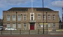 Before 1888, the Territorial Force in Hornsey used a small drill-hall at Crouch End. From 1888 they moved to the National hall on Hornsey High Street. This building was in use until in 1896 when The Elms, an old house on the site of the current drill hall was bought as headquarters for the 3rd Middlesex Rifle Volunteers.[1] By 1903, the old house had been extended to form the first a drill-hall.[2] In 1908, the Hornsey unit became the 7th Battalion, The Middlesex Regiment.[3] The battalion was mobilised at the drill hall in August 1914 before being deployed to the Western Front.[4] The drill hall was completely rebuilt in 1936.[2]