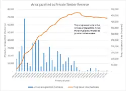 There are 1,094,000 hectares of private land in Tasmania covered by forest or plantation (841,000 hectares of native forests and 253,000 hectares of plantation)[2] As June 2023, 429,094 hectares were declared as Private Timber Reserve.[3]