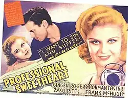 Professional Sweetheart is a 1933 American pre-Code romantic comedy directed by William A. Seiter from a screenplay by Maurine Watkins. It stars Ginger Rogers in her first film for RKO Radio Pictures, with Norman Foster, ZaSu Pitts and Frank McHugh. The film is a satire of the radio industry; since it is pre-code, Rogers spends some of her time in high heels, stockings, and a slip.