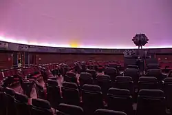 The planetarium uses a Starmaster projector, manufactured by Carl Zeiss AG, which was installed in 2006 to replace the original Universarium III purchased in 1952. 44 additional projectors are also used.[3] The projection dome has a capacity of 300 people, with a circular arrangement of reclining seats and projection at the top of the dome.[1] The dome spans 18 metres (59 ft),[2][7] and is on one floor[4] with a mezzanine.[3] The metal and concrete half-dome is surrounded by a yellow disk, and the interior is made of wood.[5]