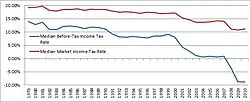 As of 2010, there were 118.7 million taxpaying households in the United States.[6] The median marginal federal income tax rate is 15%.[7] In addition, there are numerous other federal taxes and transfers that affect one's net tax burden, including federal payroll taxes (both employer share and employees share), Corporate Income Taxes, Excises Taxes, Estate and Gift Taxes, Customs Duties and Miscellaneous Receipts. According to the Congressional Budget Office (CBO), the median taxpayer in the United States has had an effective overall federal tax burden that has declined from 19.14% of Before-Tax Income in 1979 to 11.20% of Before-Tax Income as of 2010. When simply comparing Market Income to After Tax Income, due to Government Transfers the Net Federal Tax burden of the median taxpayer has declined from 13.94% in 1979 to -8.76% in 2010 - this metric became negative for the first time in 2008.