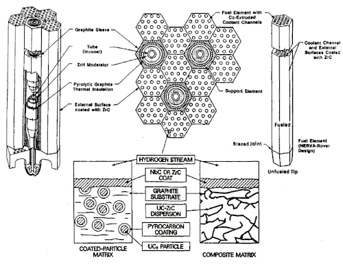 The result, Nuclear Energy for Rocket Propulsion, stated that the use of nuclear propulsion in rockets is not limited by considerations of combustion energy and thus low molecular weight propellants such as pure hydrogen may be used. While a conventional engine could produce an exhaust velocity of 2,500 meters per second (8,300 ft/s), a hydrogen-fueled nuclear engine could attain an exhaust velocity of 6,900 meters per second (22,700 ft/s) under the same conditions. He proposed a graphite-moderated reactor due to graphite's ability to withstand high temperatures and concluded that the fuel elements would require protective cladding to withstand corrosion by the hydrogen propellant.[10]