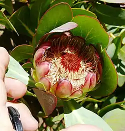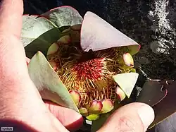 Although a 1998 source stated that the flowers are pollinated by birds,[6] other sources claim it is pollinated by rodents.[4][14][15] In 1977 the botanists Delbert Wiens and John Patrick Rourke first proposed this pollination method in certain Protea species.[15] In a 1980 magazine article Rourke explained his theory that the peculiarly hidden flower heads had evolved this trait in response to using rodents as pollination vectors,[14] thus constituting a special class of pollination syndrome.[15] Because the rodents are primarily nocturnal creatures that find their food using their sense of smell rather than their sense of sight, the flower heads are not required to be showy.[14] Furthermore, by hiding the flower heads in such a manner, the plants' chosen rodent pollinators are protected from predation by owls.[14][15] The data on this species is somewhat murky, but it appears that this is a species which primarily opens its florets at night, likely also to accommodate the pollinators. The peculiar yeasty odour of the nectar becomes stronger at night, is thought to furthermore be a specially evolved attribute which attracts rodent pollinators. The nectar of most such proteas is copious and extremely sweet, which attracts the rodents, but it also low in protein and not very nutritious, and functions more like 'junk-food' or candy. The scent is so seductive for small mammals that even gerbils (Gerbilliscus afra), which are not known as nectar-feeders, caught from areas where such proteas do not grow, are readily attracted to the rodent-pollinated protea flower heads as opposed to those of bird-pollinated proteas when experimentally exposed to both. Rodents in captivity which were fed a diet of only nectar died after five days. The amount of nectar produced by a particular population is only sufficient to sustain the local rodents for several days a year.[15]