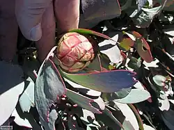 It has large, thick, glaucous and glabrous leaves.[5][6][10][13] These leaves are 3–4.5 inches (7.6–11.4 cm) in length and 1–2 inches (2.5–5.1 cm) broad at the widest parts, although they are only 4.2mm wide at the base (where they connect to the petiole). The shape of the leaves is obovate and cuneate, and the ends of the leaves are rounded (obtuse). The leaves are distinctly veined.[13]