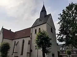 A church in Borgholzhausen was first mentioned in a 1169 document as a church (Eigenkirche) of the Counts of Ravensberg.[1] The present church, replacing earlier structures, was built beginning in 1340. It was expanded by a Gothic choir in 1496.[2][3] A carved stone altarpiece was added in 1501.